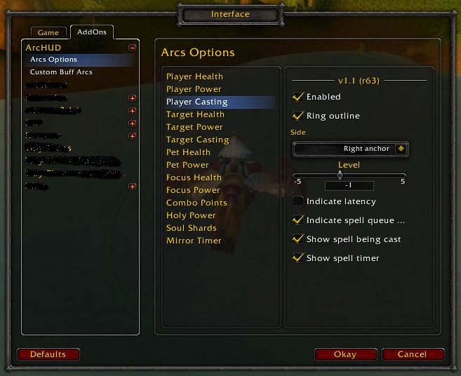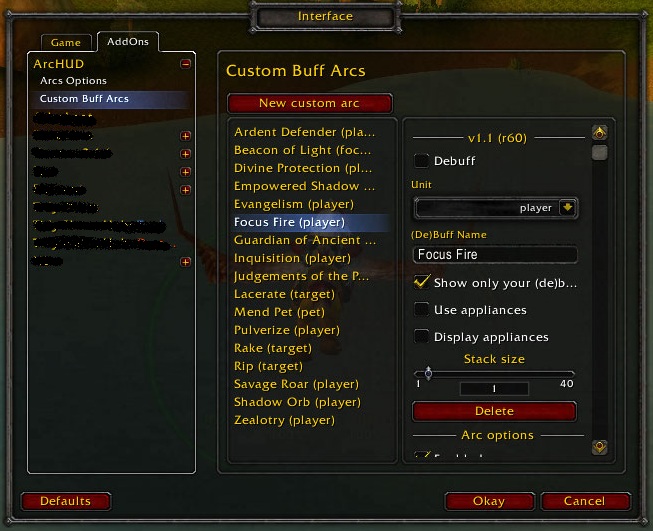 - Custom (de)buff arcs: Ever wanted to keep track of the stacks and/or remaining times of some specific (de)buffs such as Evangelism, Savage Roar, Beacon of Light, Weakened Soul, etc? Then just create your own custom (de)buff arc for it!