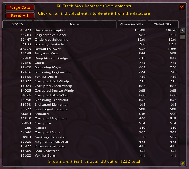 There is also a friendly list that you can bring up to display all mobs with their NPC id, global kill count and kills on the current character (Command: /kt list).