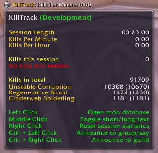 By using the command /kt immediate (or /kt i for short), you will get a small frame that shows you how many kills you've made since running the command. This can be useful for times when you need to kill a certain number of mobs, but do not wish to reset your session statistics. Simply run /kt i and it will track how many kills you do until you close it, reopening the frame will reset the count.