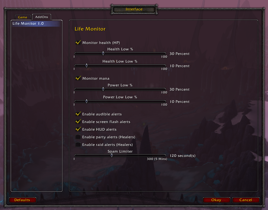 Monitors your health and your mana (if used) and alerts on multiple levels and multiple ways. If your health or mana get low the following alerts can be used.