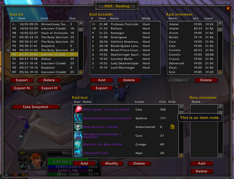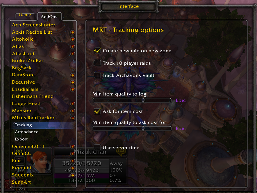 Mizus RaidTracker is an easy to use addon for tracking raids, loot and attendance. It provides solid automatic tracking functions, a simple to use GUI for modifying tracked data and a CTRaidTracker compatible data export.