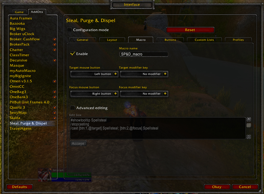 SP&D creates a dispel macro for you that uses your dispel spell. The macro casts your dispel spell on your target or your focus depending on your choice. You can easily modify buttons and modifiers used by the macro with a dedicated interface. You can also completely edit this macro to your taste.