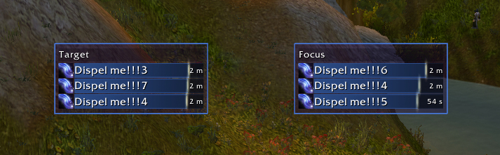 SP&D provides an alternative way to cast your dispel spell by creating a button corresponding to your target and to your focus. Clicking on these buttons will automatically cast your dispel spell on the concerned unit. Due to blizzard addon restrictions, these buttons cannot be completely hidden if your target or focus has nothing to dispel, but the transparency can be modified and set to 0.