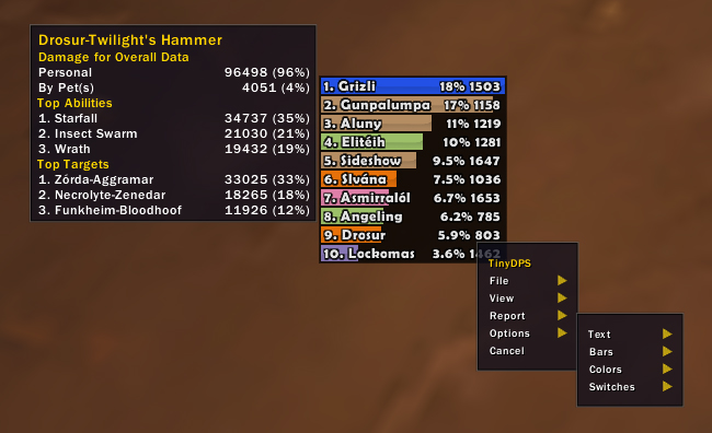 Looking for an addon to measure damage and healing without adversely affecting your gameplay experience? TinyDPS should suit your needs. By excluding unnecessary features (graphs, pie charts, extensive data collection, etc.) and offering a minimalistic interface, TinyDPS attempts to maintain a balance between information and performance.