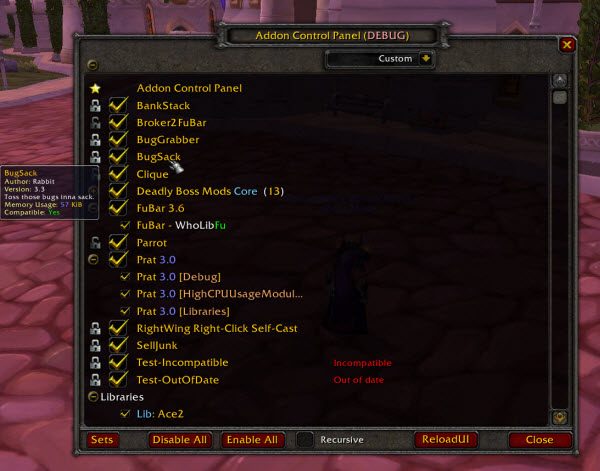 ACP adds the "Addons" button to the game's main menu (The one you get when you hit ESC). It allows you to manage your addons in game, with an interface which looks similar to the blizzard addon manager. ACP will help you deal with the "Clutter" that multi-part addons and libraries introduce by displaying your addons in logical arrangements. ACP has many features to make your addon list easy to manage, help you with missing libraries, and provide you with detailed information about each addon.