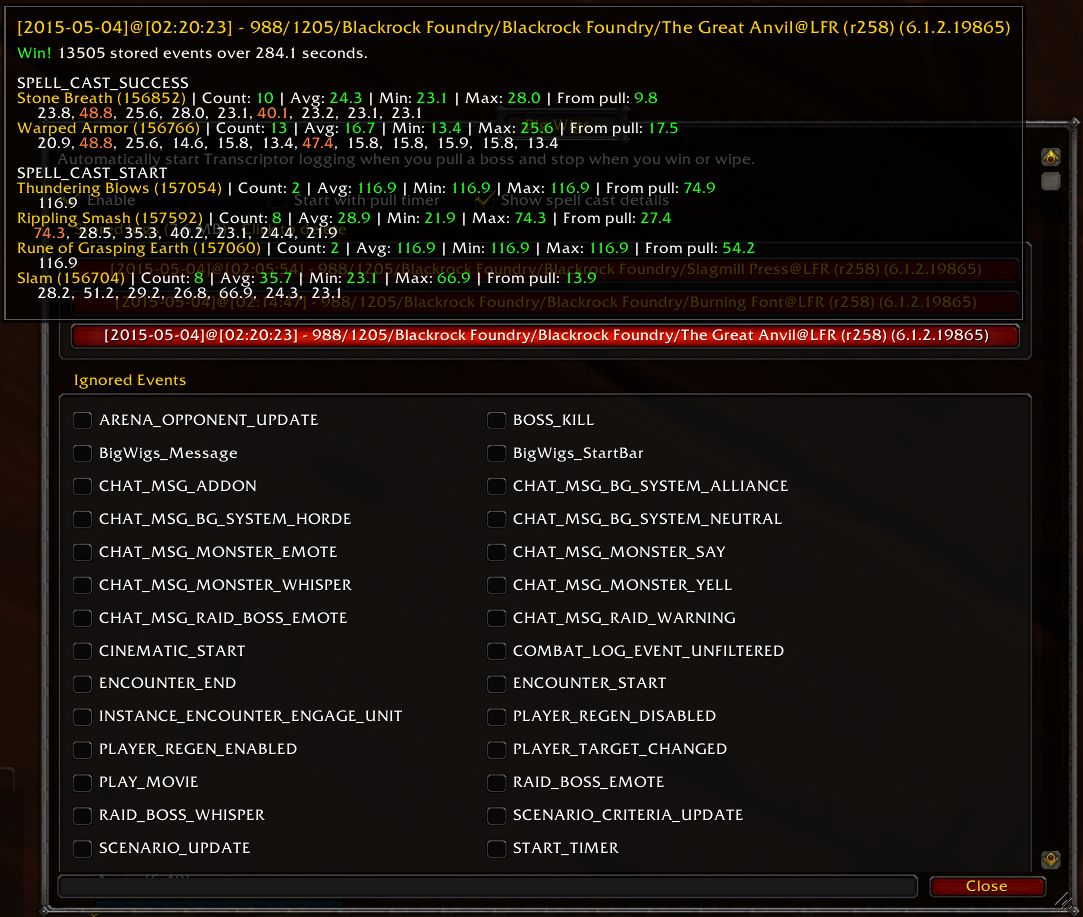 Should note that if you're wiping a lot and not clearing logs, memory usage can get high and at some point the game will throw an error and nil out Transcriptor's database the next time the ui loads, ie, you lose everything! If that happens, your SavedVars/Transcriptor.lua will still have whatever was last saved to it until you reload ui or logout, so copy it somewhere else if you want to save it.