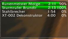 This addon shows the health of the bosses you have encountered (including the current fight). It is mainly intended as an addition to any boss mod that lacks of such a display (like BigWigs) but might be useful even in combination with full-featured mods (like DBM) due to its feature to keep track of the past fights to compare their outcome.