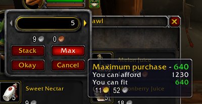 The BuyEmAll window has Stack and Max buttons which allow you to enter a full stack or as much as you can afford/fit. Hovering over the buttons shows a tooltip with the number of items you will be buying and how much it will cost. See Notes for information on the maximum you can buy.