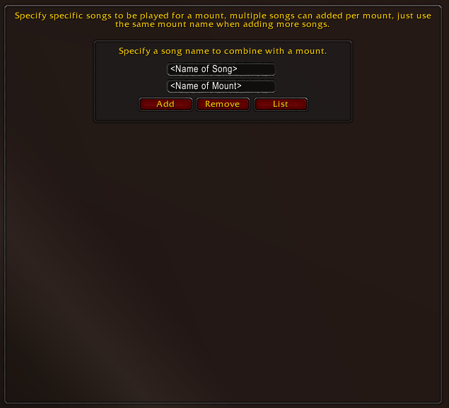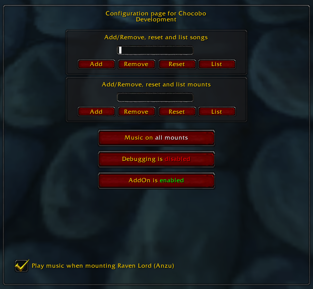 The other option is to use the interface options, simply navigate to Chocobo -> Custom Songs and use the two textboxes to specify song and mount name, then use the buttons to add, remove or list songs.