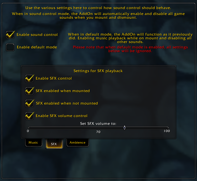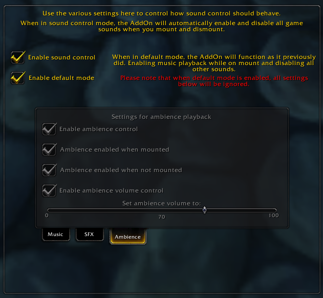 - Music/SFX/Ambience enabled when not mounted - This works like the former option, except backwards! The respective sound will be enabled when you are not mounted.