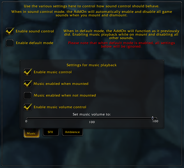 - Enable default mode - When this is checked, sound control will behave like it used to, enabling music playback when you mount and disabling it when you dismount. This setting overrides any settings in the three panels.