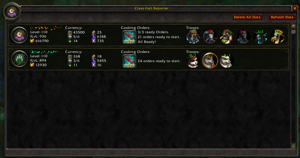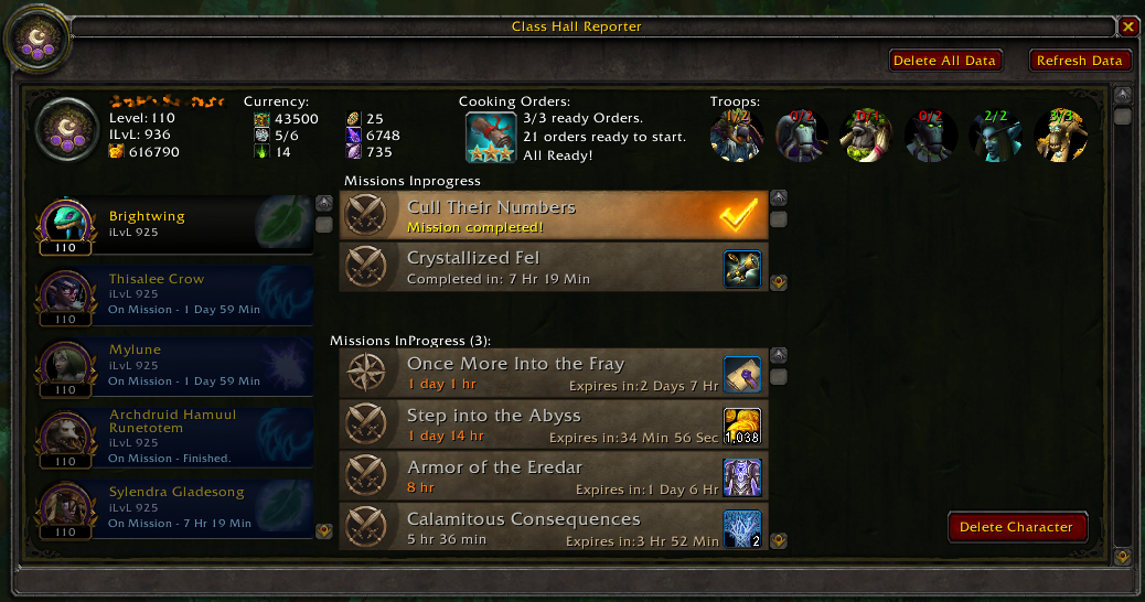 This addon allows you to view all the needed information from each character's class hall such as missions, followers, troops, resources and more!