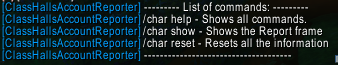 - /char show - Shows the Report frame (same functionality as clicking the minimap icon).