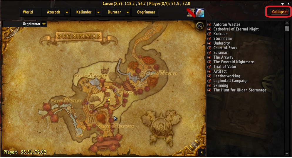 Since Combining the Quest log with the World Map, there is no way to quickly collapse all zones/categories in the quest list without a script. This simple addon adds a button to the World map above the quest log that collapses all zones in the list for better visibility of the quests you want to see.