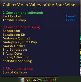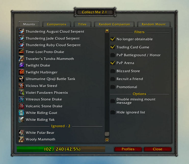 Collect Me keeps track of your mounts, companions, titles, toys and followers in the game and can show you what mounts, companions, titles and toys you're missing with additional information on where to get them. It can also summon companions and mounts randomly from a user defined list.