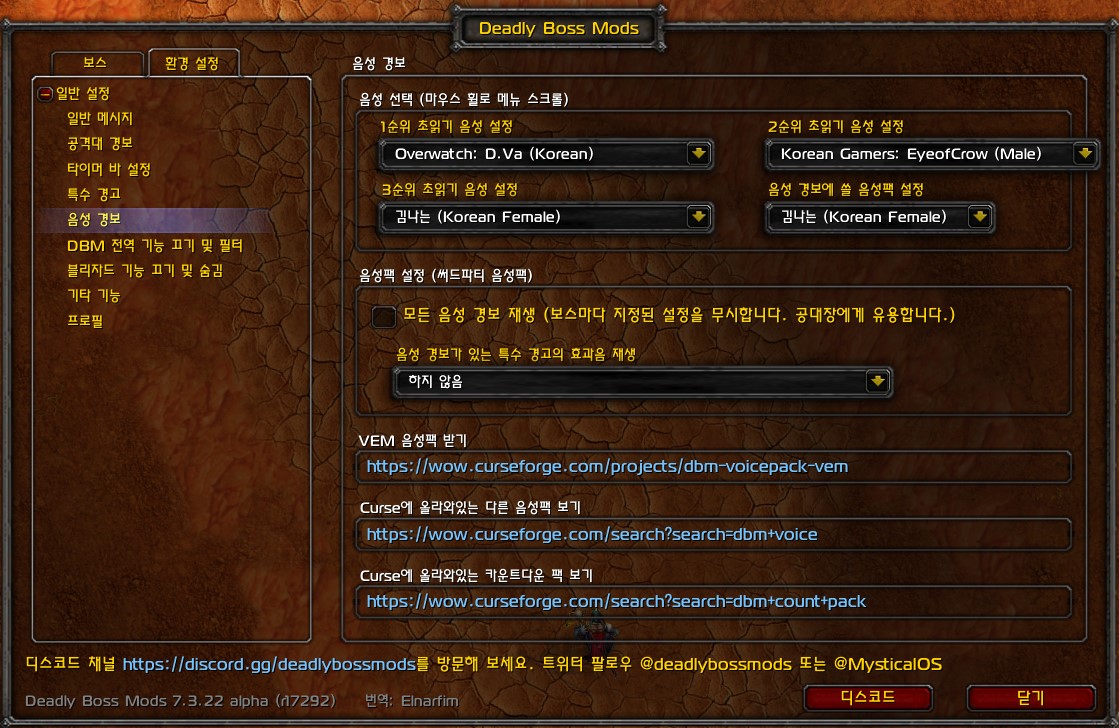 설치 후 DBM 설정창에서 위 스샷처럼 '음성 경보에 쓸 음성팩 설정' 옵션에서 음성팩을 지정하면 작동합니다.