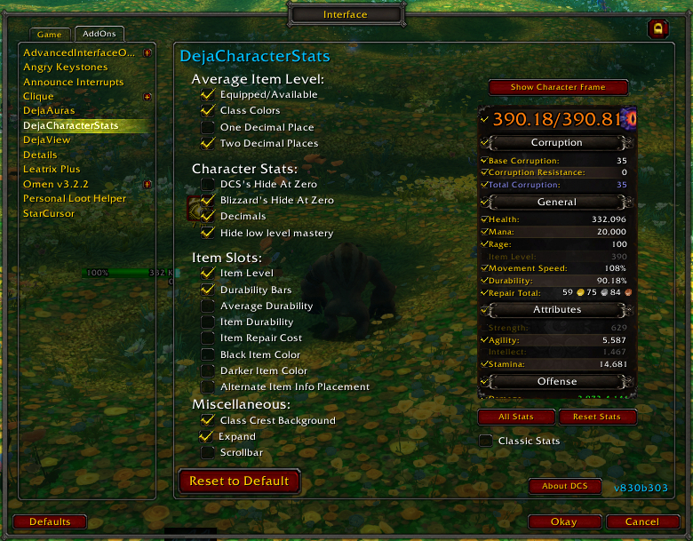 - /dcstats reset: Resets DejaCharacterStats options to default.