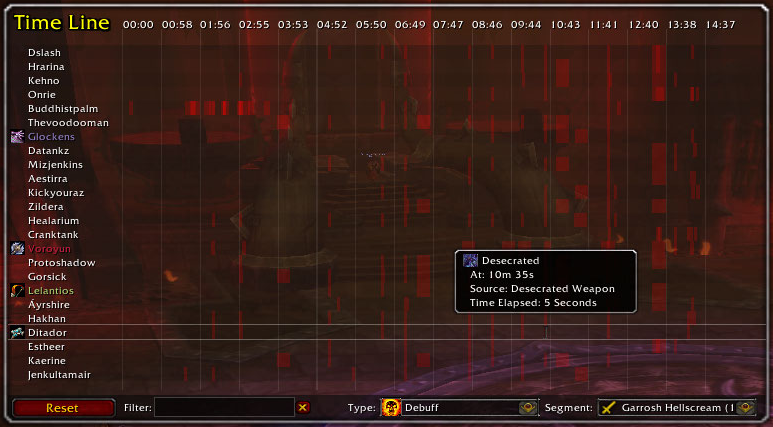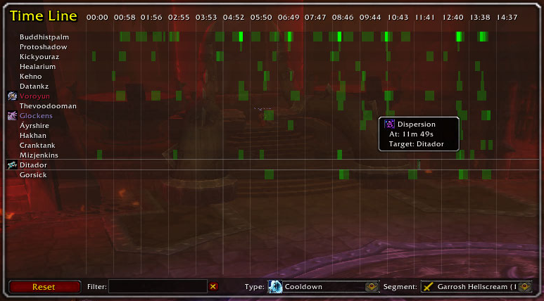 A time line window showing when boss casted spells, when players used cooldowns and when the boss applied debuffs in the raid.