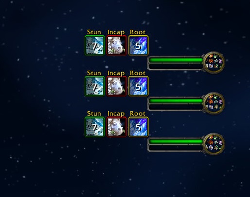 Diminish attaches icons to unit frames or nameplates, displaying time left until a crowd control diminishing returns category expires for that unit. As well as how far the category is diminished. (Green border = 50% duration, yellow = 25%, red = 0%)