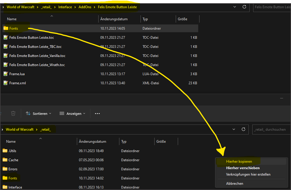 Ja. Du kannst dafür einfach den im Addon Ordner enthaltenen Font in das Verzeichnis _retail_Fonts oder _classic_Fonts kopieren und Wow neu starten. Hab einen Screenshot hochgeladen zur Verdeutlichung. Wenn du wieder den Standard haben willst, einfach den Fonts Ordner wieder löschen. Du kannst übrigens auch jede andere Schriftart nutzen. Sie muss allerdings GENAU so heißen wie im Fonts Ordner (FRIZQT__.ttf).