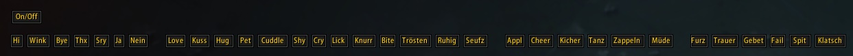 Es handelt sich um eine minimalistische, transparente Leiste mit von mir häufig benutzten Emotes, die über einen separaten Button bei Bedarf an- oder ausgeschaltet werden kann. Bei bestimmten Emotes passieren noch "Dinge", Liste s. u. ๐