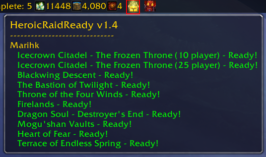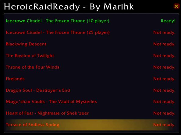 HeroicRaidReady checks whether you have completed the achievements required to enter Heroic difficulty raids. Note that only certain raids have entrance restrictions. The raids that are currently tracked are:
