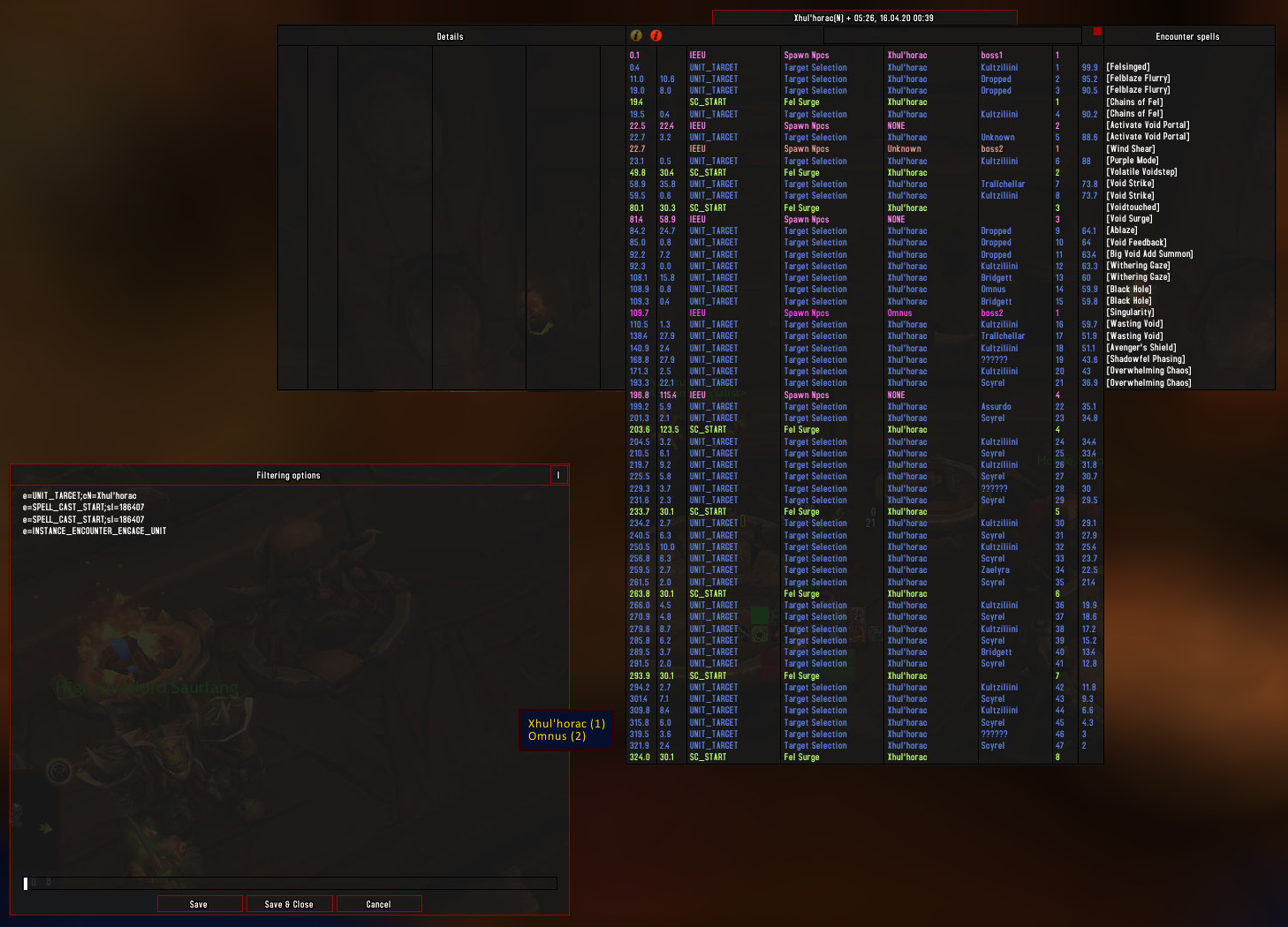 Split different argument with ';', eg. k=v;k=v;k=v e=2; si=205231; tn=Tichondrius; cn=Beholder , shows every event where event is SPELL_CAST_SUCCESS, spellID = 205231, caster name (sourceName) = Beholder and the target is Tichondrius