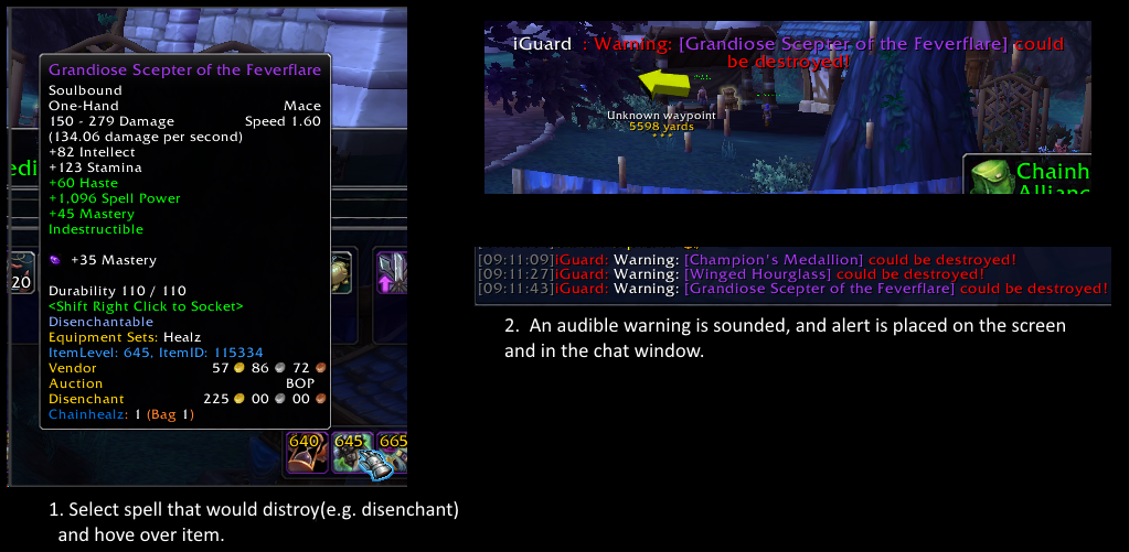- Warns you when you are about to destroy (e.g. disenchant) a protected item (configurable).