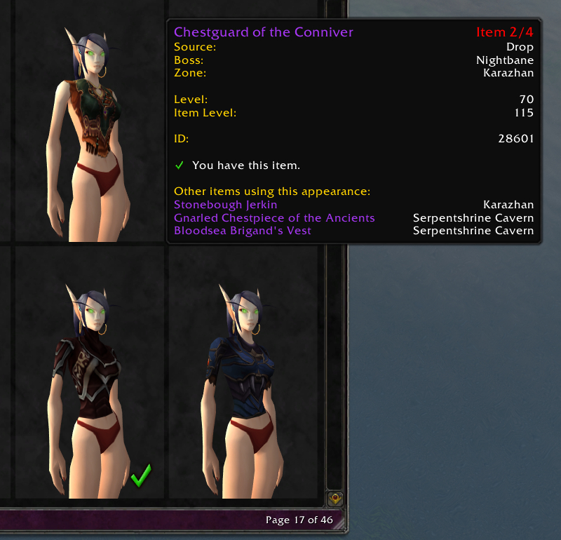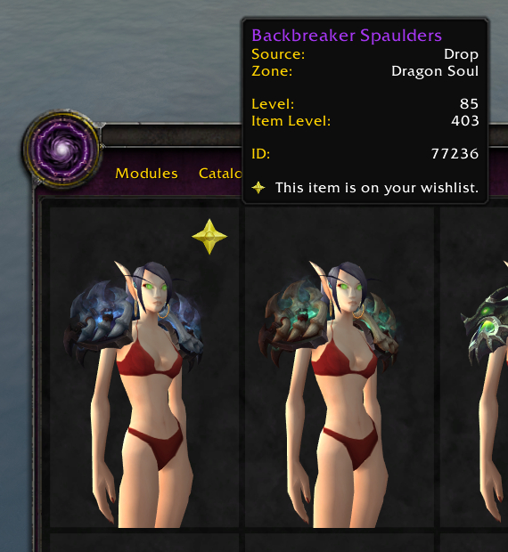 - Items outside of the catalogue may take into account items that aren't usable by your character (eg wrong class or faction) when indicating collected items.