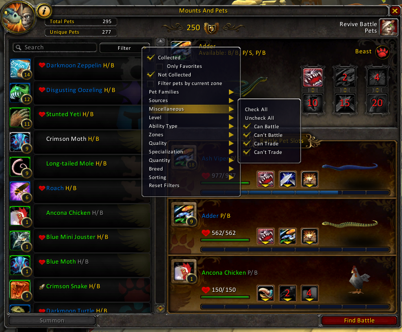 - Sort Pets by level, alphabetical, pet type, rarity, pet specialization, Breed