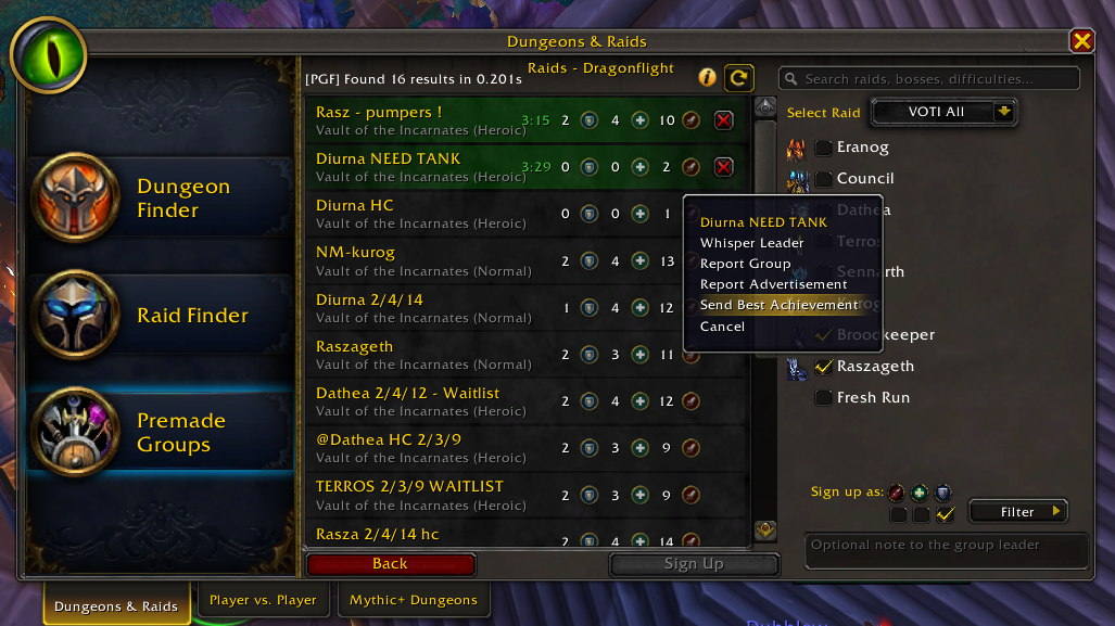 - Right click on a group when viewing raids and you can select to send your raid achievement for that specific raid to the leader (Prio goes: CE, Mythic Bosses in progress order, AOTC; Normal Clear).