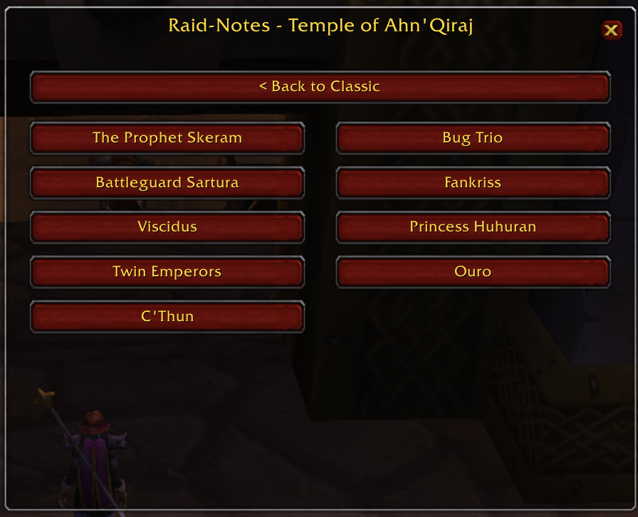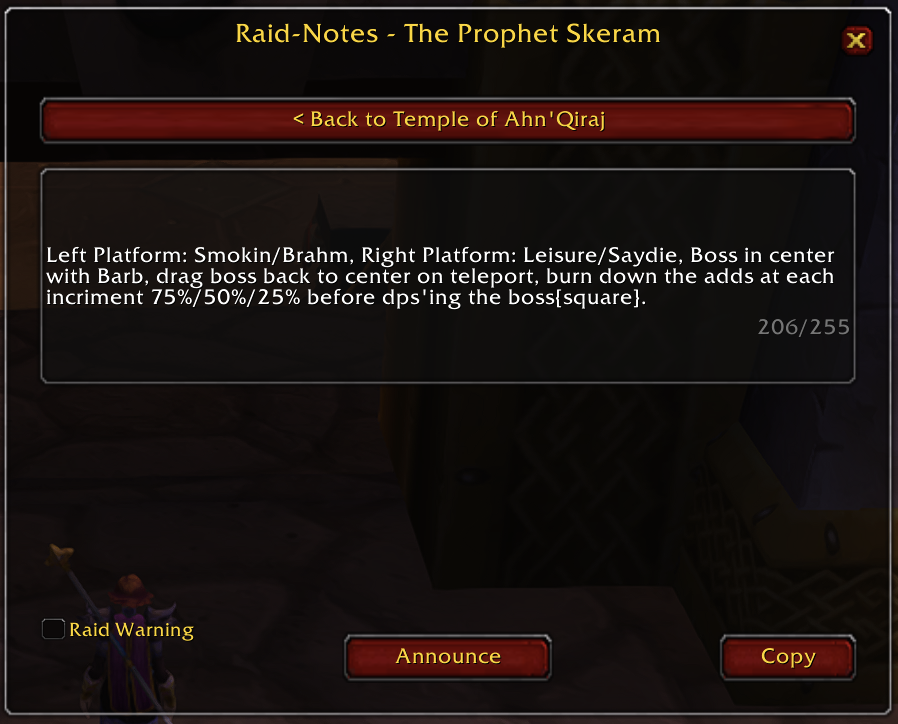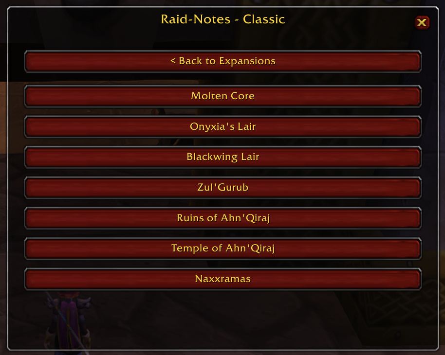 A comprehensive raid organization addon for WoW Classic that helps you create, store, and share boss strategies across all raid content from Classic through Mists of Pandaria. Features an intuitive 4-screen navigation system (Expansions → Raids → Bosses → Notes), persistent note storage, quick raid shortcuts (like `/rn mc` for Molten Core), and instant strategy sharing with `/rn mc ragnaros announce`. Perfect for raid leaders and players who want organized, accessible boss notes with seamless raid chat integration.