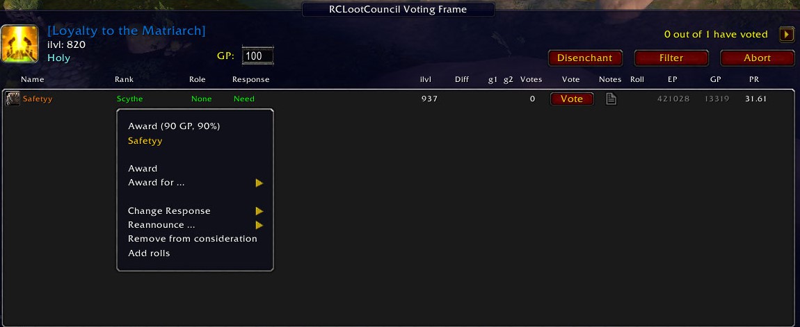 - Award GP automatically without any extra click. Simply click the first button of the rightclick menu in the RCLootCouncil Voting Frame to award item and GP value at the same time.