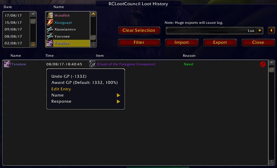 - When a player change the mind about the loot after receiving it, guild Admins can visit RCLootCouncil Loot History ("/rc history") to undo last GP action or award GP to the player. If the response is changed or the player who received the item is changed, first click the 1st button in the rightclick menu to undo the previous GP, then use other buttons to change the response or the name of player who received the item, then award the GP by clicking the 2nd button in the rightclick menu.