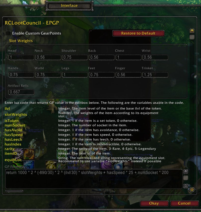 - Formula is used to calculate the GP value of the item. Formula should be written in LUA code. But you don't need any programming knowledge. For the most guild, you just need to summarize your rule into a simple one-line math formula and enter the formula into the RCLootCouncil-EPGP settings. Formula must returns a number(Don't need to be an integer. The addon will do rounding.)