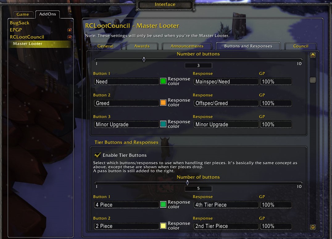 - Loot master can assign percentage GP value to the different responses from the raid members. The setting is in Interface->Addons->RCLootCouncil->Master Looter->Buttons and Responses. The final gp value calculated by the addon normally is itemGP*responseGPPercentage.