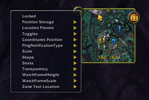 Previously only available on WoW Interface... This is a relatively simple modification of the minimap to allow adjustment of the shape, transparency, visibility of certain default buttons, scroll-wheel zooming, coordinates display, etc.