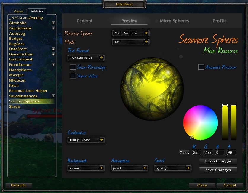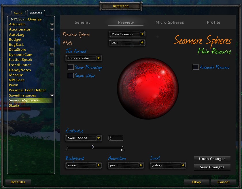Sphere textures and animations may be modified through the "Preview" tab of the config panel. (No changes are committed until saved)