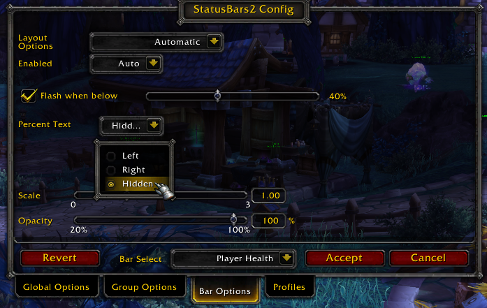 - Auto: Bar is visible in combat, but fades out when out of combat and the bar is at it's default value (100% for health and mana, 0% for energy, etc.)