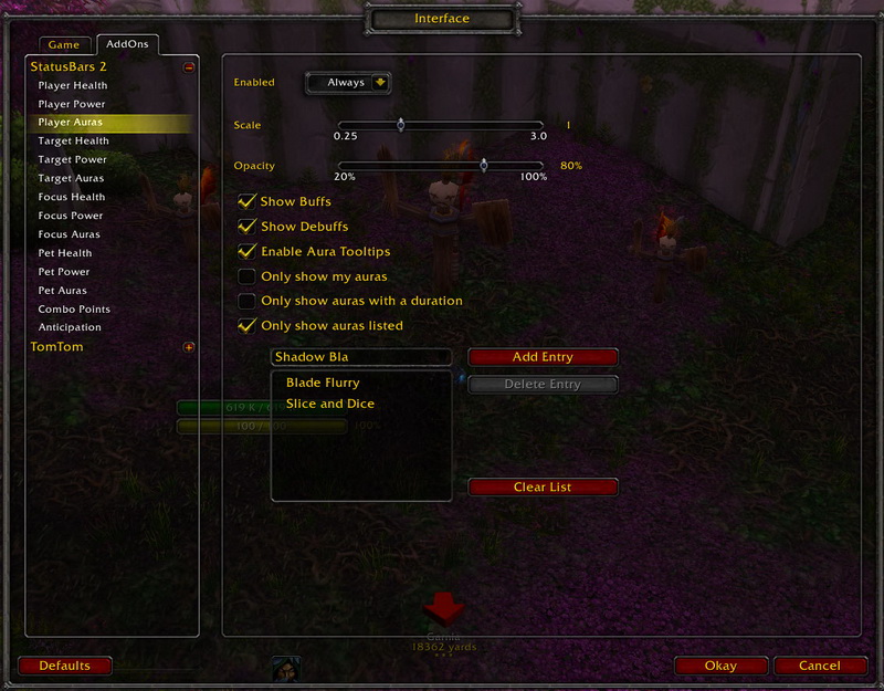 StatusBars2 creates on-screen, status bars for your health, mana, energy, class-specific powers (combo point, soul shards etc.), buffs and debuffs