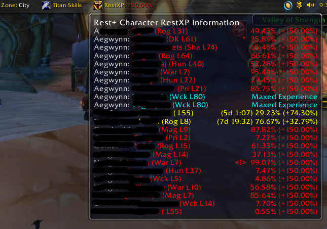 TitanRestPlus is a RestXP-displaying Titan plugin that features a compact and customizable display. It has been coded especially to assist players who have characters on more than one server -- for this reason, the display is very compact (allowing more characters to be shown than similar mods can), and it groups and sorts characters by server (with the current server displayed at the top of the list). The list is colorized based on the state of each character's Rest level.