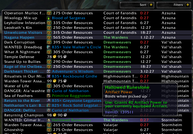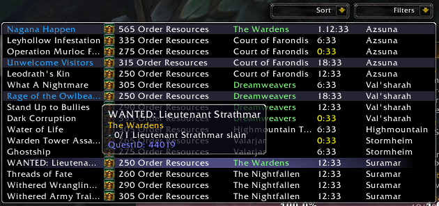 Compact list of all world quests in current zone or whole Broken Isles. New quests will be highlighted, so you can easly check them. Factions with active bounty quests are marked with green color.
