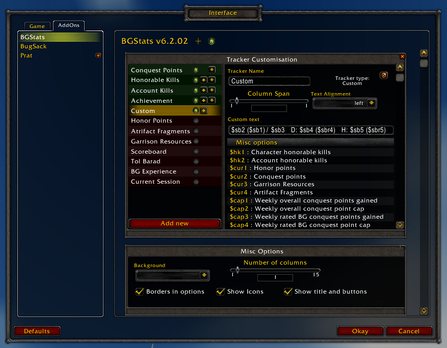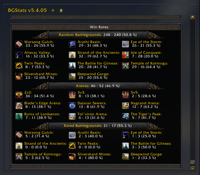 BGStats is a small addon that allows an easy overview of some of the basic stats related to bettlegrounds and general PvP.