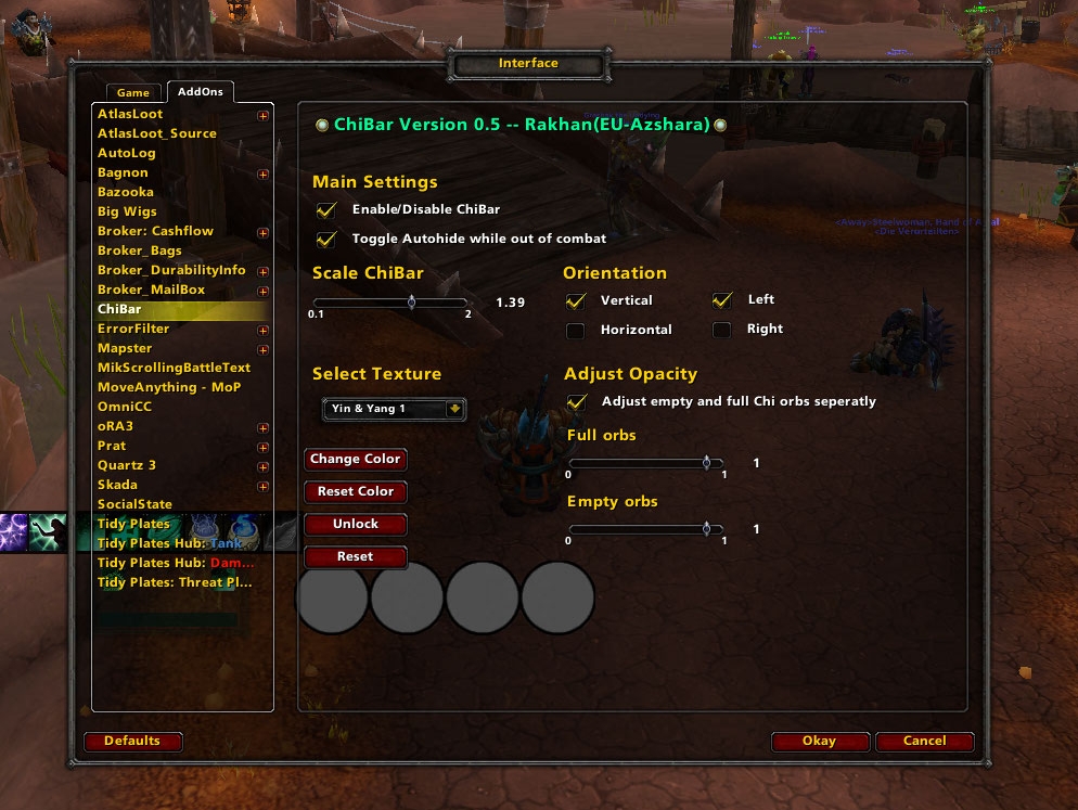 - Access the options through GameMenu>Interface>AddOns>ChiBar ...