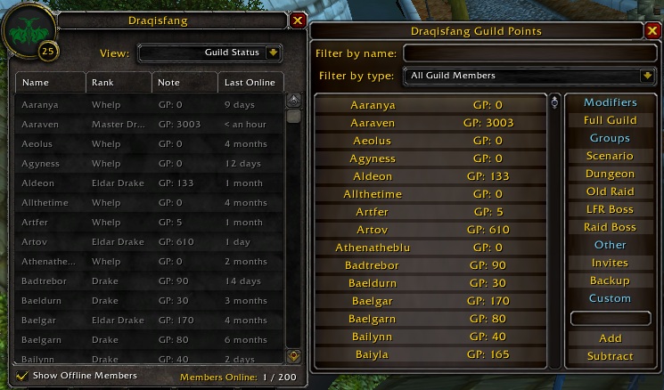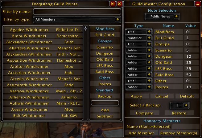 Keeps track of guild points using the guild public notes. Multiple guild members can be selected and points added or subtracted using the pre-defined buttons or a user-defined amount.