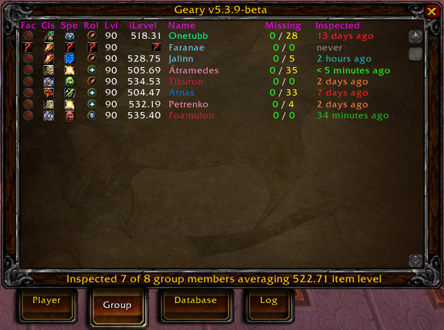 - Group tab - Shows the database stored inspection results of all party/raid members