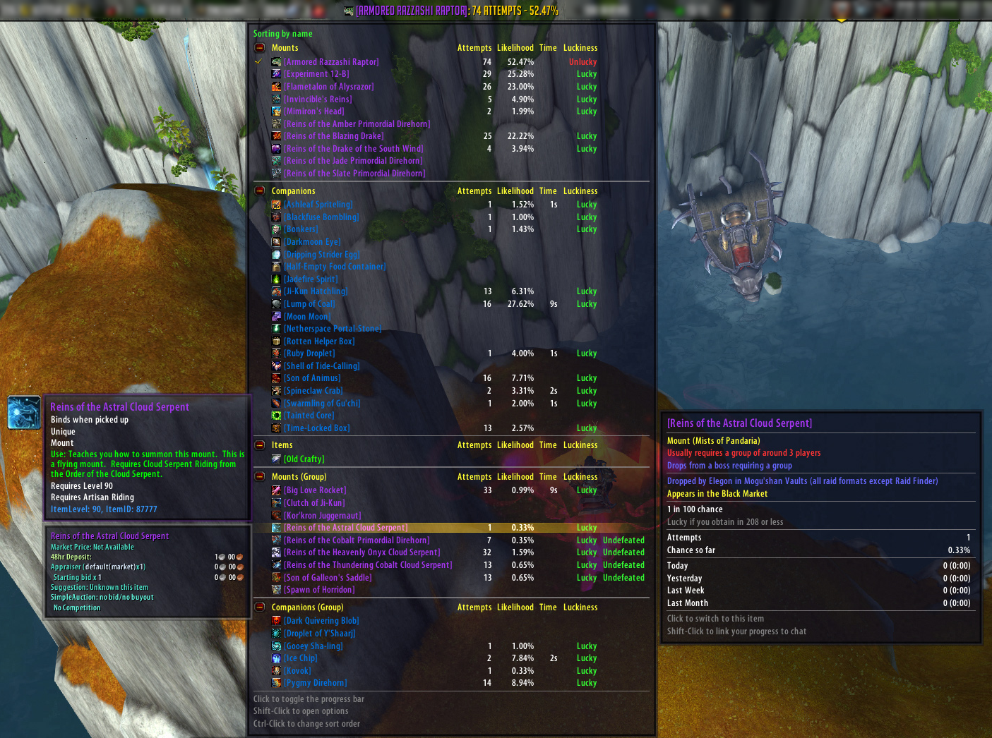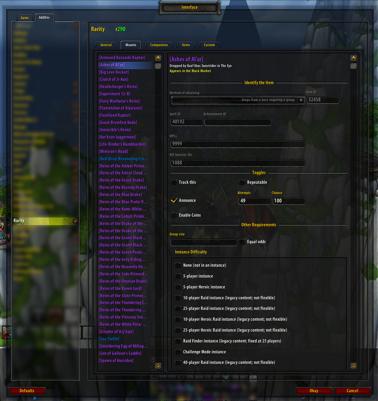Rarity tracks how many times you've tried to obtain various rare items like mounts, battle pets, and toys. It will tell you how likely you are to obtain the item, track how long you've been farming for it, and tell you how lucky you've been so far. Although it's mostly used for mounts, battle pets, and toys, it supports pretty much any item, including profession patterns, archaeology projects, and more.