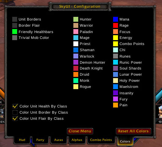 * Added various color options in the config menu, with the option of resetting all colors to default values.