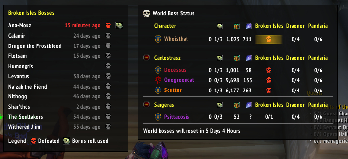 - Tracks all the Shadowlands, BfA, Legion, WoD and MoP world bosses.