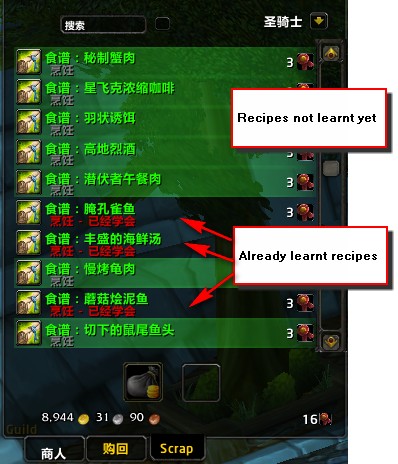 • Gegenstände, die man nicht benutzen kann, werden rot markiert und es steht direkt dran, wieso man sie nicht benutzen kann. • Rezepte, die man nicht gelernt hat, werden grün markiert und Rezepte die man bereits erlernt hat, sind unmarkiert. (Auf mehrfachen Wunsch)